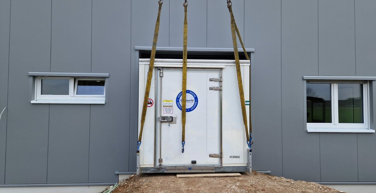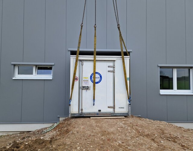 Eine besondere Herausforderung des Projekts war die Einbringung der Kühlzellen in das Lager. Da die Fläche vor dem Hallentor noch nicht ausreichend befestigt war, wurde für das Anheben der Zellen ein Telekran mit grosser Ausladung eingesetzt.