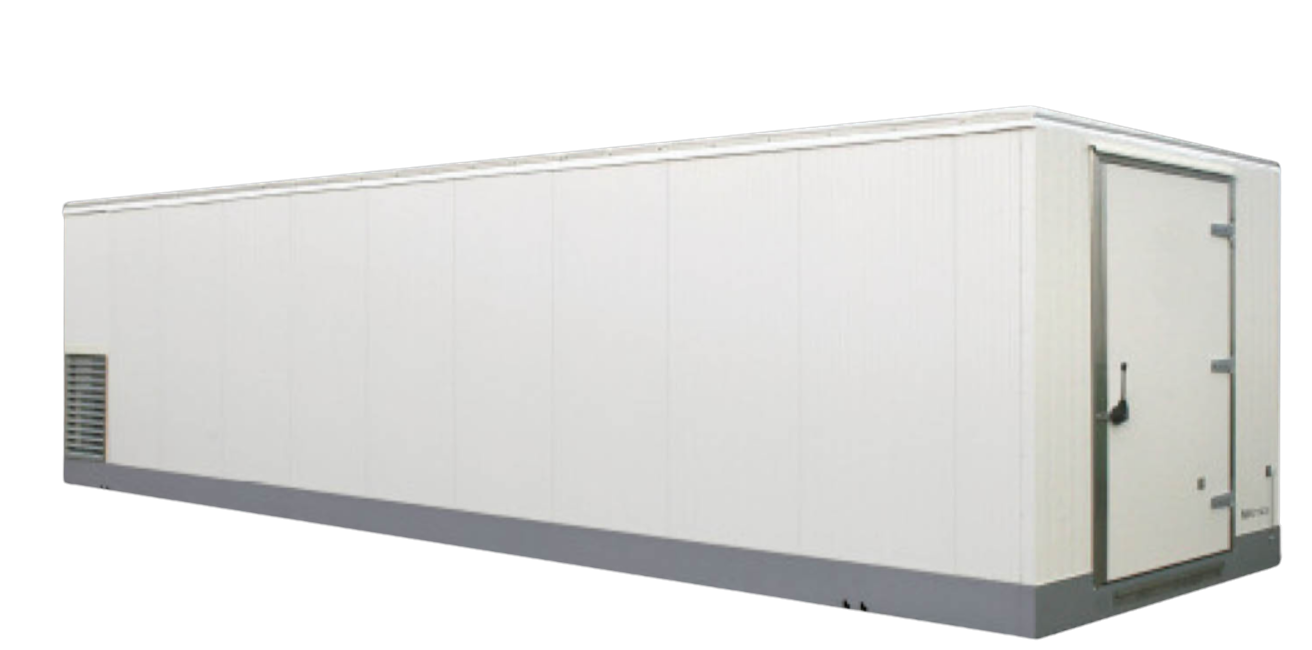 Mobile Kühlzelle mit einem Volumen von 84 m³ und einer großen Kühlkapazität. Die Kühlzelle ist mit einem flachen rutschfesten Boden und Beleuchtung ausgestattet. Die Tür hat eine sehr niedrige Einstiegshöhe und lässt sich leicht öffnen – auch von innen. Die Kühlzelle erfüllt die HACCP/GMP-Anforderungen und verfügt serienmäßig über einen Datenlogger. Sie lässt sich mit einem Kran-LKW einfach aufstellen, auch an schwer zugänglichen Stellen, sowohl drinnen als auch draußen. Die Kühlzelle ist energiesparend und hat einen niedrigen Schallpegel. Auch in redundanter Ausführung erhältlich.