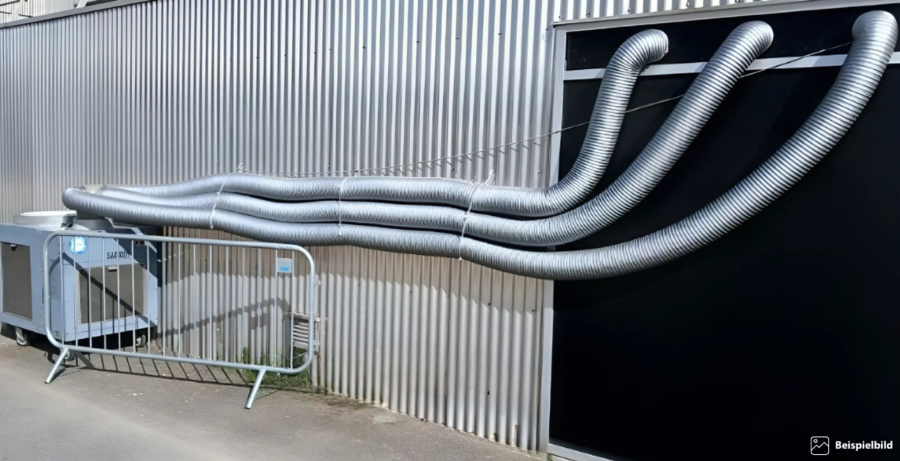 Zwei 10 kW-Spot-Klimageräte außerhalb des Gebäudes leiteten kalte Luft über Schläuche ein. Hierfür musste der Lüftungsstrom der vorhandenen Anlage angepasst werden.