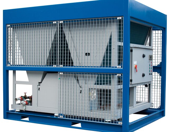 Chiller / Air-cooled Heat pump with 125 kW Cooling capacity and 144 kW Heating capacity. This low-energy low-noise machine is ready for use.The machine is mounted in a robust frame with a shock-resistant grid for condensor protection and can be moved easily with a forklift or crane.