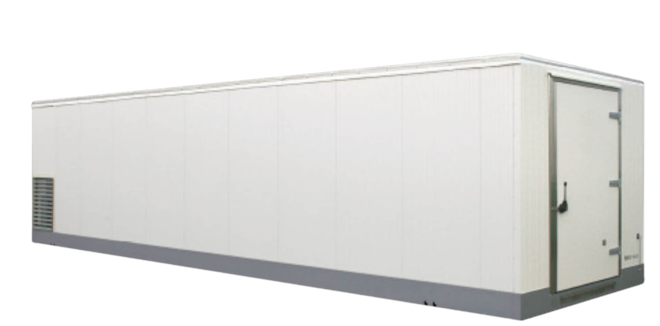 Ready-for-use mobile cold storage cell with a volume of 84 m³ and a large refrigeration capacity (overcapacity). The cold storage cell has been fitted with a flat anti-skid floor, lighting, a door that opens smoothly (also from the inside), and has a very low entry height. The cold storage cell meets the HACCP/GMP requirements, and standard features include a data log system. The unit is easy to install with a crane truck. The storage cell is low noise and low power.